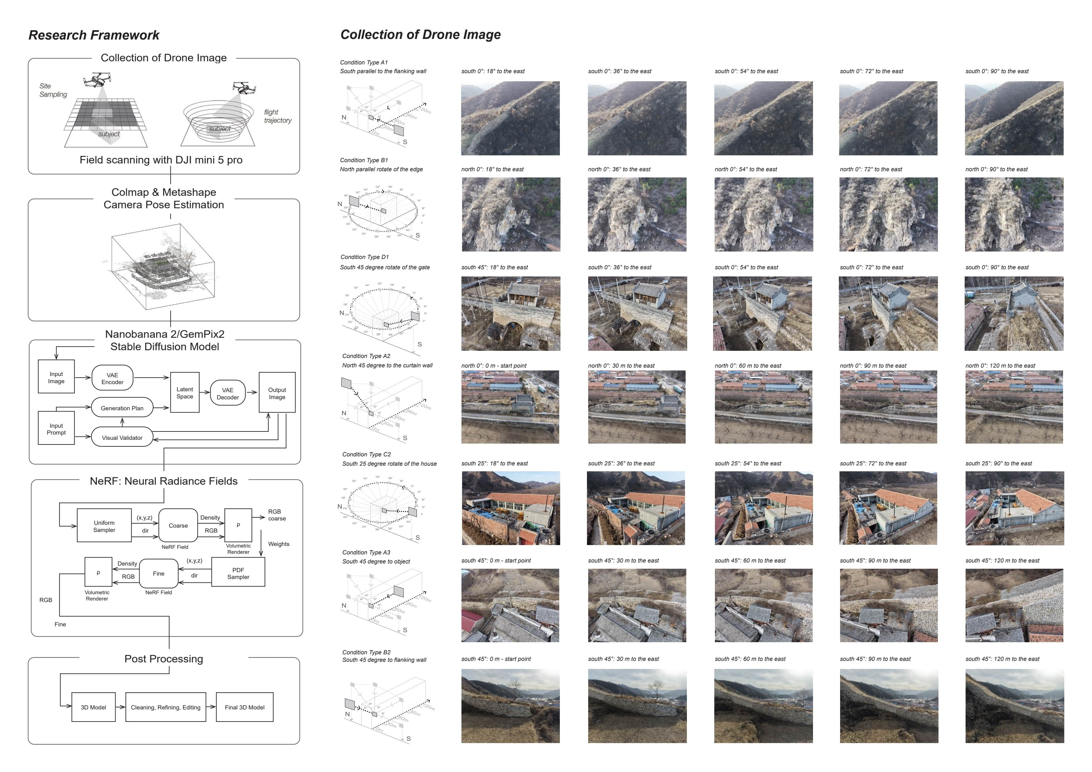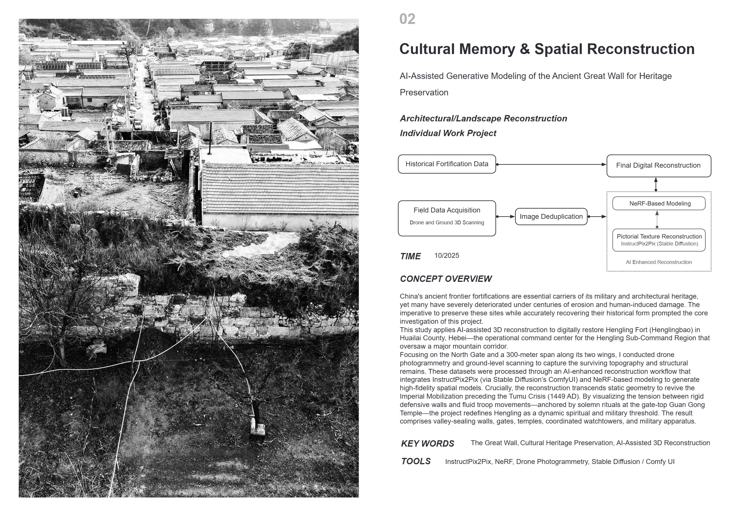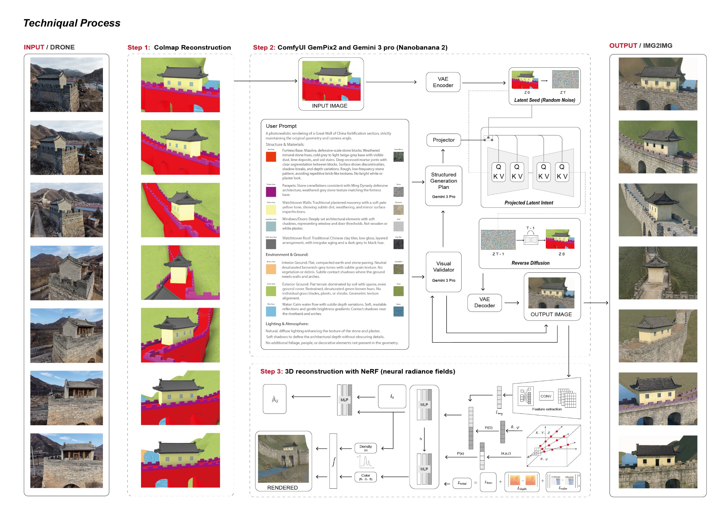 A digital preservation project focusing on Hengling City's Great Wall. Utilizing DJI drone photogrammetry (1600+ photos), the project reconstructs the site in 3D. It further employs InstructPix2Pix (Stable Diffusion) for texture regeneration and NeRF technology to create a comprehensive analytical model, recontextualizing the historical spatial relationships.